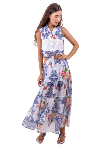 BliteILARY 義大利古董印花綁帶背心襯衫 | 寶藍
