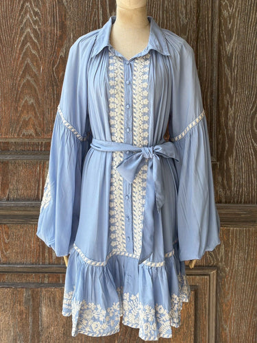 MJGF66 復古繡線繡花襯衫領短洋裝|粉藍
