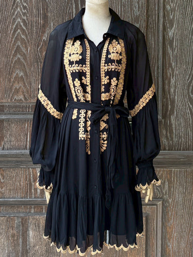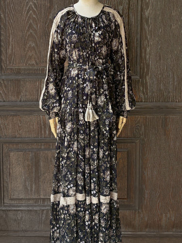 MJDH62印花綴雷斯長袖洋裝|黑