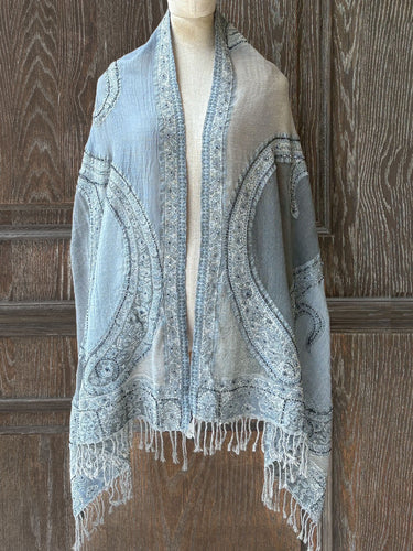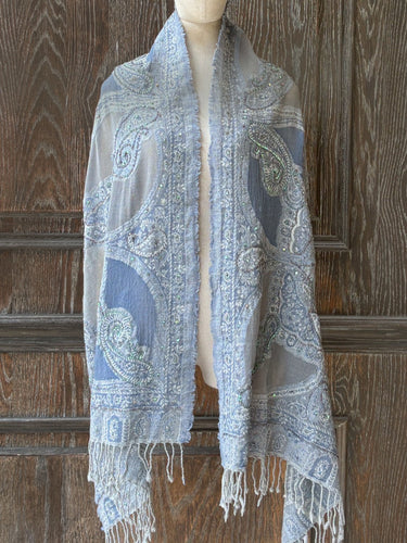 MJL120 佩利斯手縫珠印花毛料圍巾|灰藍